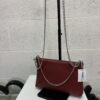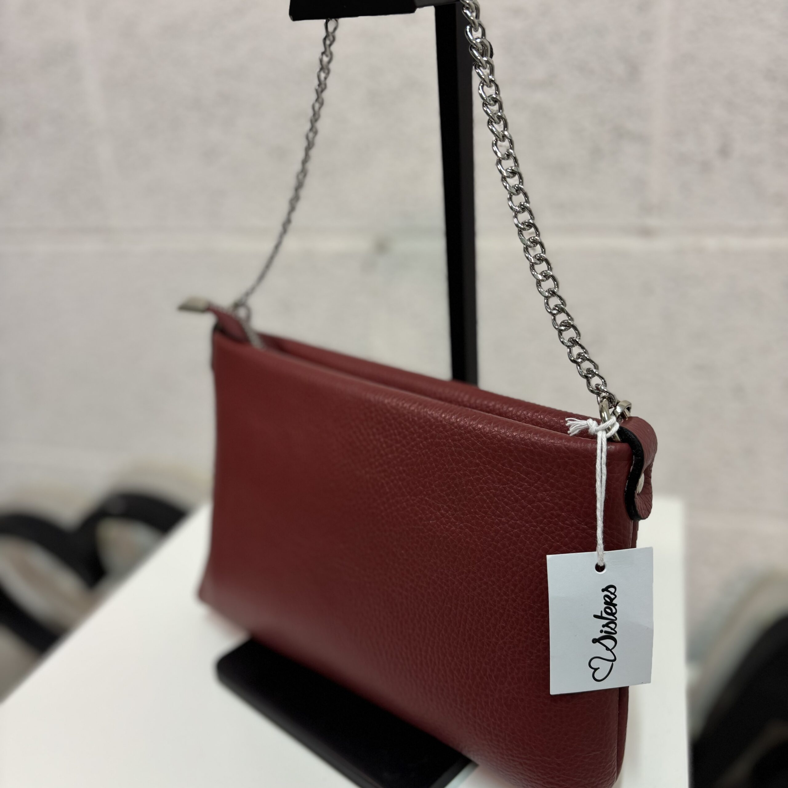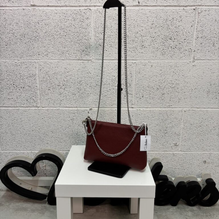 Borsa in pelle bordeaux con taschini interna e catena corta e lunga in argento.